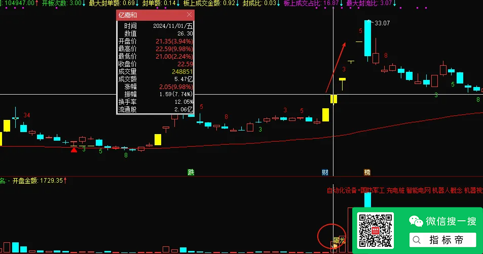 7.主图左上角的数值,封板时间,是第一次封涨停板的时间,开板次数是打开涨停板的总次数,最大封单额是盘中买一位置曾经达到的最大封板资金量,封单额是收盘时,买一位置的封板资金量,板上成交金额是当天以涨停价成交的总金额,封成比是当天封单额除以全天成交额的值,板上成交占比是板上成交金额占全天成交金额的比例,最大封流比是最大封单额占流通市值z的百分比。