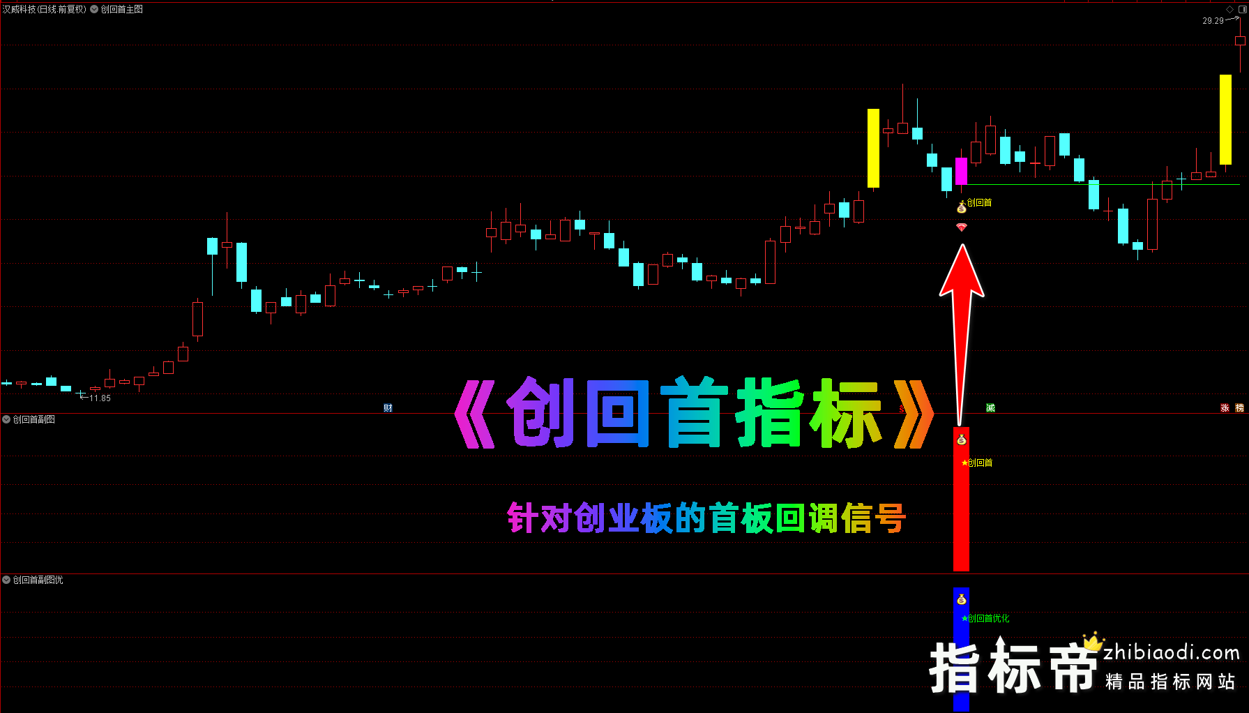 创回首指标仅针对创业板使用,首板回调后的高胜率操作指标,不适合主板。专门针对创业板首板回调的操作秘籍-配合选股公式使用能筛选出潜力股。